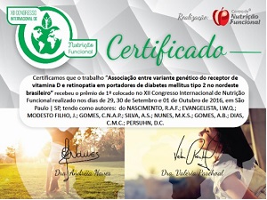 O trabalho premiado foi: “Associação entre variante genético do receptor de vitamina D e retinopatia em portadores de diabetes mellitus tipo 2 no Nordeste brasileiro”, desenvolvido no Hospital Universitário Lauro Wanderley (HULW). Esse trabalho foi apresentado no congresso pelo mestre Rayner Anderson Ferreira do Nascimento do Programa de Pós-Graduação em Biologia Celular e Molecular do Centro de Ciências Exatas e da Natureza (CCEN). São coautores os doutores Isabela Queiroga do Centro de Referência Oftalmológica (CEROF), Cecília Pegado da Nefrologia, João Modesto Filho da Endocrinologia, Darlene Camati do Departamento de Biologia Molecular, Alexandre Sergio Silva da Educação Física e a mestranda Mayara Nunes. A premiação foi de R$ 2.500,00 e um certificado.