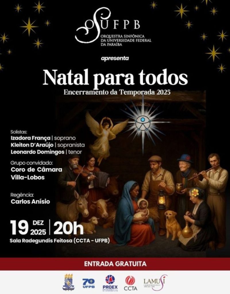 Concerto gratuito celebra o espírito natalino com repertório que vai do barroco ao popular, encerrando o ano musical da OSUFPB em grande estilo