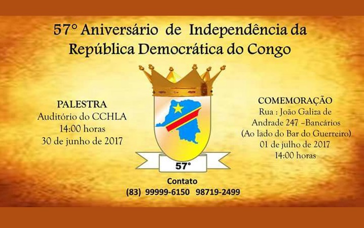 Para celebrar o 57° aniversário de independência da República Democrática do Congo, estudantes congoleses que realizam intercâmbio na UFPB promoverão um evento nos dias 30 de junho e 1° de julho. De acordo com a coordenação, a intenção é proporcionar um enlace cultural de conhecimentos sócio-históricos, amizade e fraternidade entre congoleses, brasileiros e estudantes de outros países africanos.