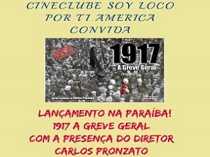 O Cineclube Soy Loco por Ti America traz o diretor argentino Carlos Pronzato para o lançamento na Paraíba do seu documentário “1917 A Greve Geral”. O lançamento ocorre nesta sexta-feira (23), às 16h30, no cine Aruanda do Centro de Comunicação, Turismo e Artes, da Universidade Federal da Paraíba (CCTA/UFPB) no Campus I, em João Pessoa.