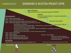 Serão realizadas desta segunda-feira (5) até 16 deste mês as inscrições para o “I Seminário e Mostra PROEXT da Universidade Federal da Paraíba (UFPB) – I SEMIPROEXT”. O evento está programado para o dia 3 de novembro. É uma realização da Coordenação de Educação Popular da Pró-Reitoria de Extensão e Assuntos Comunitários (COEP/PRAC).
