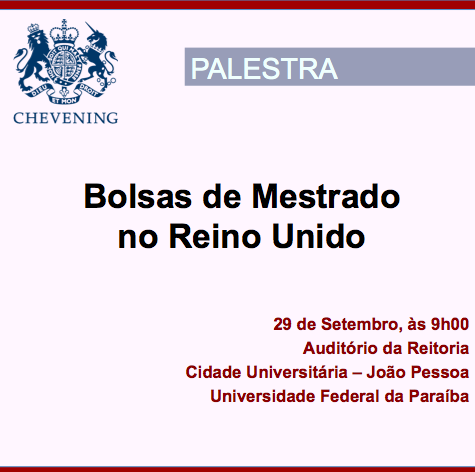 O Programa Idiomas/Inglês sem Fronteiras (Assessoria Internacional) da UFPB convida a comunidade acadêmica para a palestra sobre o Programa de Bolsas Chevening no dia 29 de setembro de 2015 às 9h no auditório da reitoria.