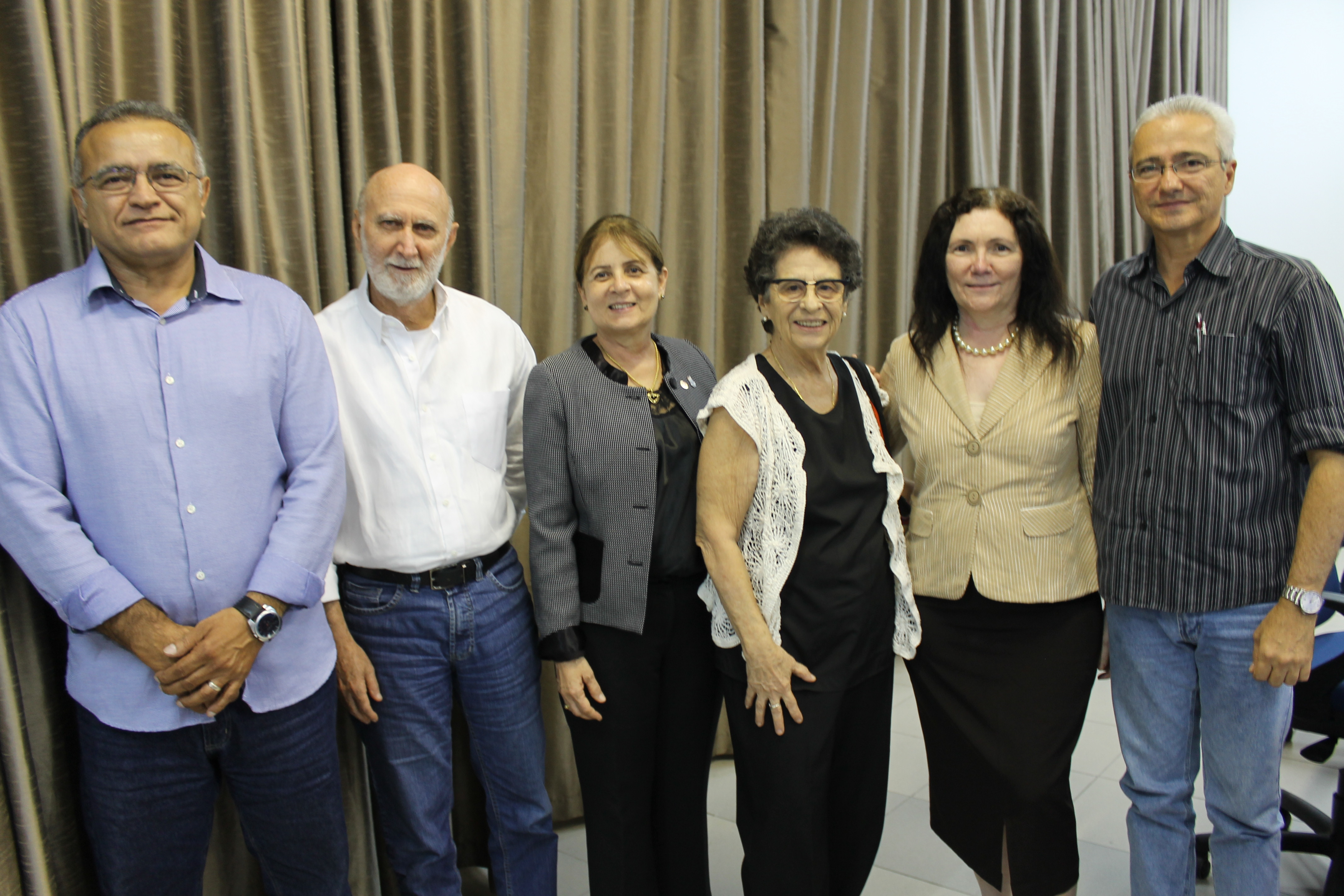 No registro fotográfico dos gestores da UFPB com a escritora, a partir da esquerda, o chefe de gabinete Raimundo Barroso Jr, o pró-reitor de gestão de pessoas Francisco Ramalho, a reitora Margareth Diniz, a palestrante Maria Valéria Rezende, a assessora Aline Monte e o coordenador do Forum Universitário Lúcio Flávio Vasconcelos.