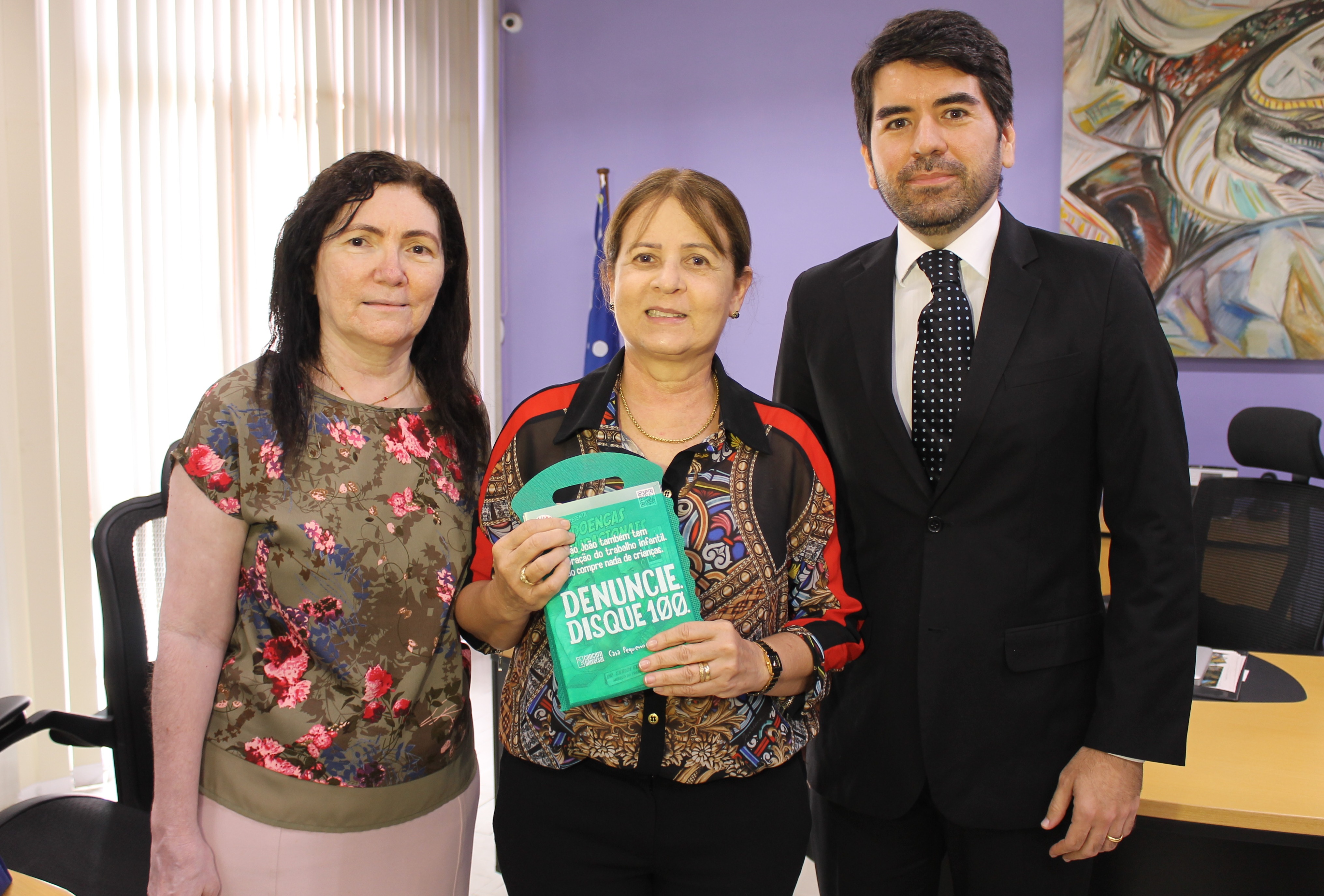 Leitão veio tratar da renovação do convênio de estágio entre as entidades e aproveitou a oportunidade para entregar em mãos, à gestora, um kit contendo cartilhas da Série MPT em Quadrinhos. A visita foi acompanhada pela chefe de gabinete da UFPB Aline Montes (à esquerda na foto).