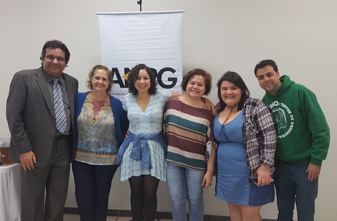 No registro fotográfico, à partir da esquerda, os palestrantes Isac Medeiros, a pró-reitora de pesquisa e inovação da UFG Maria Clorinda Fioravanti, a presidente da ANPG Tamara Naiz, a secretária executiva de ciência e tecnologia do Ceará Nágyla Drumond e membros da ANPG.