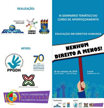 O III Seminário Temático do Curso de Aperfeiçoamento em Educação em Direitos Humanos – “Nenhum direito a menos!” - acontece nesta terça-feira (30), das 8h00 às 12h00 e das 14h00 às 18h00, no Auditório do Centro de Ciências Jurídicas da Universidade Federal da Paraíba (CCJ/UFPB), no Campus de João Pessoa.