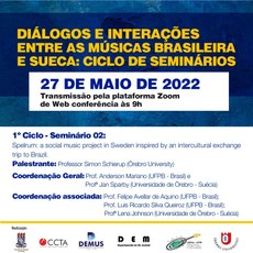A Universidade Federal da Paraíba (UFPB) e a Örebro Universitet apresentam neste dia 27 mais um seminário remoto do projeto "Diálogos e interações entre a música brasileira e sueca: ciclo de seminários”, decorrente do acordo de cooperação acadêmica entre as instituições – que também prevê o intercâmbio de estudantes e professores –, é coordenado na UFPB pelo Laboratório de Guitarra Elétrica e Música Universal (LGEMU/CCTA/UFPB) e organizado em parceria com a universidade sueca.