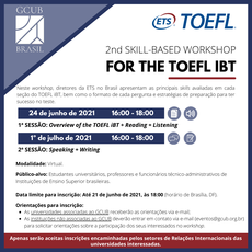 O Grupo Coimbra de Universidades Brasileiras - GCUB, em parceria com a Educational Testing Service - ETS, organização responsável pelos testes TOEFL IBT e GRE em todo o mundo, oferecerá duas sessões do Skill-Based Workshop for the TOEFL iBT Test.