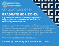 O Refugee-Led Research Hub (RLRH) da Universidade de Oxford oferece vagas no programa Graduate Horizons, que disponibiliza mentoria para processos seletivos de mestrado, e possibilidade de obter bolsas de estudos, para estudantes afetados por deslocamento, como refugiados, solicitantes de asilo, apátridas, entre outros.