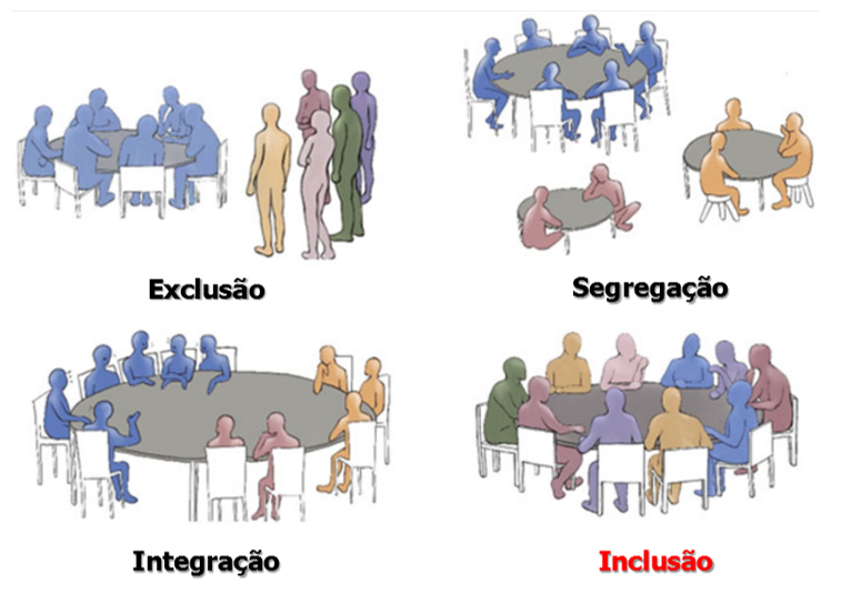 A segregação e a integração foram retratadas por Mengmeng Luo, enquanto a exclusão e inclusão foram ilustradas por Meghan Crebbin-Coates. A exclusão ocorre quando “alguns grupos têm o acesso negado”; a segregação pode ser entendida como “a tentativa de criar um clima de participação ‘separado, mas igual’” e a integração reflete a “união de grupos anteriormente segregados” (Bisson et al., 2021, p. 11). Busquemos a inclusão!