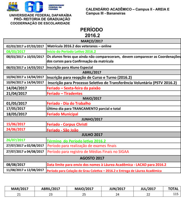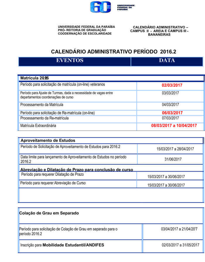 CALENDÁRIOS ACADÊMICO E ADMINISTRATIVO – Campus II – AREIA e Campus III – Bananeiras