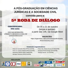 O PROJETO DIREITO COM CIDADANIA e o PROGRAMA DE PÓS-GRADUAÇÃO GRADUAÇÃO EM CIÊNCIAS JURÍDICAS DA UFPB convidam para a 5ª RODA DE DIÁLOGO, que acontecerá a partir de 05/10, sempre das 14h00 às 17h00.