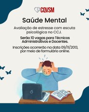 A Comissão de Saúde Mental e Qualidade de Vida informa que será realizada, em 14/11/2023, a Avaliação de estresse com escuta psicológica no CCJ. Serão 10 vagas liberadas para servidores técnico-administrativos e docentes!