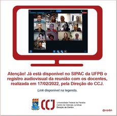 A Direção do Centro de Ciências Jurídicas da UFPB realizou reuniões de boas-vindas ao período 2021.2 com os docentes, em 17/02/2022, e com os técnicos-administrativos e docentes, em 18/02/2022. Para assistir as gravações clique no link correspondente:.