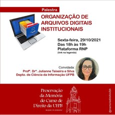 O Projeto de Extensão de Preservação da Memória do Curso de Direito da UFPB, vinculado à Direção do Centro de Ciências Jurídicas, realizada na próxima sexta-feira, a palestra “Organização de Arquivos Digitais Institucionais”. A palestra é aberta a toda a comunidade e será proferida pela convidada Professora Doutora Julianne Teixeira e Silva, do Departamento de Ciência da Informação da UFPB.