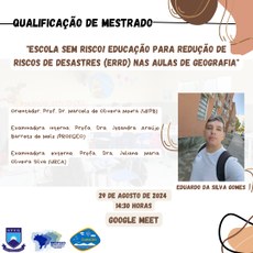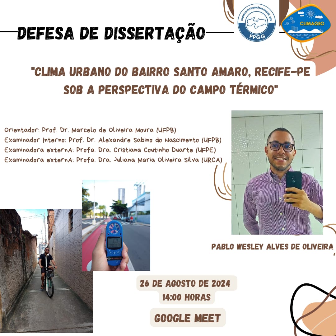 Na próxima segunda-feira (26/08/2024), às 14h, haverá a Defesa final de Dissertação do nosso integrante Pablo Wesley Alves de Oliveira. O trabalho é intitulado "Clima urbano no bairro Santo Amaro, Recife - PE, sob a perspectiva do campo térmico" e tem como orientador o Prof. Dr. Marcelo de Oliveira Moura.