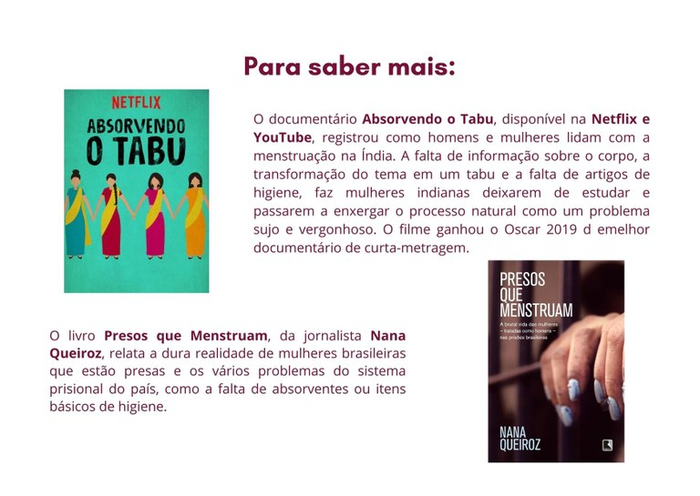 Em dezembro de 2020, o Conselho Nacional de Direitos Humanos recomendou aos presidentes da República, Senado e Câmara dos Deputados que fosse criada uma Política Nacional de superação da pobreza menstrual para garantir que itens básicos de higiene, como absorventes, fossem distribuídos para todas as brasileiras. Além disso, também recomendou a aprovação e regulamentação do Projeto de Lei 4.968/2019, que institui o Programa de Fornecimento de Absorventes Higiênicos nas escolas públicas e do PL 3.085/2019 que prevê a isenção de Imposto de Produtos Industrializados sobre os absorventes. O primeiro, que está em tramitação na Câmara dos Deputados, foi apresentado em setembro de 2019, pela Deputada Federal Marília Arraes (PT/PE), mas até hoje aguarda a designação de um relator na Comissão de Defesa dos Direitos da Mulher.