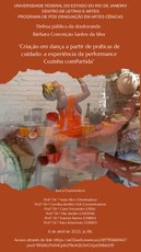 Defesa pública da doutoranda Bárbara Conceição Santos da Silva - professora do DAC/CCTA/UFPB, intitulada "Criação em dança a partir de práticas de cuidado: a experiência da performance Cozinha comPartida", em 11 de abril de 2023, 15h, por este link (ID da reunião: 857 5926 6940 - Senha de acesso: 540471).