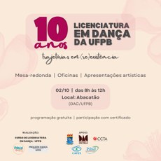 O curso de Licenciatura em Dança - DAC/CCTA/UFPB começará a celebração dos seus dez anos de funcionamento na próxima segunda-feira, 02 de outubro de 2023, no bloco C/Abacatão, com mesa-redonda, apresentações artísticas, coffee-break e oficinas.