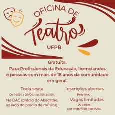 A oficina de teatro é uma possibilidade para você conhecer essa arte e também ampliar o seu universo artístico e cultural, possibilitando o trabalho reflexivo e crítico, por meio de jogos e da encenação propriamente dita.