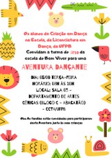 Oficina desenvolvida pela turma do componente curricular "Criação em Dança na Escola", do curso de Licenciatura em Dança, e coordenada pela Profa. Dra. Michelle A. Gabrielli Boaventura - DAC/CCTA/UFPB, para as crianças da Turma do Urso, da Escola do Bem Viver em comemoração ao Dia da Amazônia, 05 de setembro.