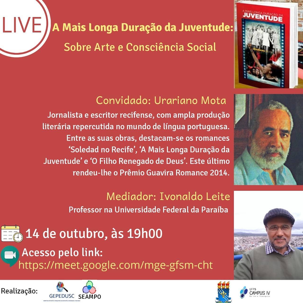 Esse episódio será realizado no dia 14 de outubro de 2020, às 19h, contará com a participação do jornalista e escritor recifense Urariano Mota e mediação do Prof. Dr. Ivonaldo Leite – docente do DED, professor do PPGE da UFPB e líder do GEPEDUSC.