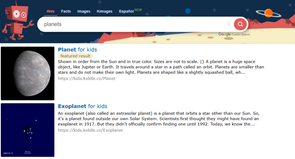 • Safe search results: Kiddle filters search results to exclude explicit or mature content.