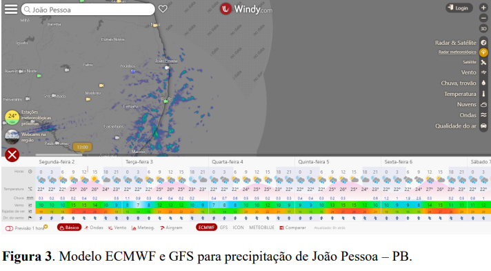 De acordo com os Modelos ECMWF e GFS (Figura 3), ao longo da semana terá sol entre nuvens e possibilidade de pancadas de chuvas ao longo da costa leste do NEB, principalmente sob os estados da Paraíba e Pernambuco. Espera-se chuvas fracas e temperaturas variando de 22º a 25ºC para essas localidades em análise.