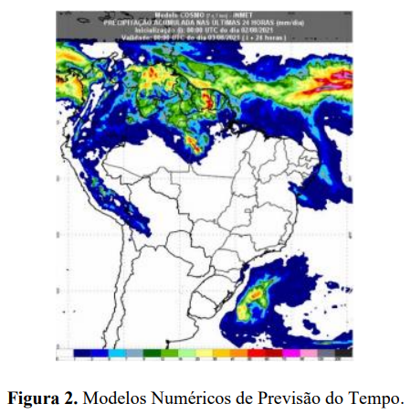 A partir de dados do Instituto Nacional de Meteorologia (INMET) as análises dos principais Modelos Numéricos de Previsão do Tempo, especialmente dos diversos campos meteorológicos do Modelo Numérico COSMO indicam os seguintes destaques na Previsão da Chuva Acumulada. Para Região Nordeste do Brasil (NEB), há previsão de condições favoráveis para chuvas isoladas (totais diários de até 20 mm) no litoral norte da Bahia e de Pernambuco como pode ser observado a partir da Figura 2 abaixo:
