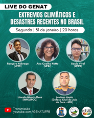 A live contará com a presença de especialistas no tema, o prof. Ranyére Nóbrega (Universidade Federal de Pernambuco), a Profa. Ana Coelho Netto (Universidade Federal do Rio de Janeiro), o Prof Saulo Vital (Universidade Federal da Paraíba), o Lincoln Muniz Alvez (INPE/IPCC) e o Joviano Assis (Defesa Civil de Juiz de Fora - MG).