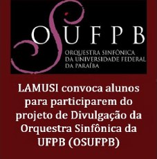 O Laboratório de Música Aplicada - LAMUSI convoca alunos para participarem do projeto “Divulgação da OSUFPB - Orquestra Sinfônica da UFPB”, aprovado pelo Edital PROEX Nº 14/2025 - PROBEX 2025-2026. Serão aceitos alunos na condição de voluntários, com preferência para os cursos de Jornalismo, Mídias Digitais, Relações Públicas e Cinema. Mas alunos de outros cursos também poderão ser aproveitados, desde que num ramo de conhecimento que dialogue transversalmente com as demandas do projeto.