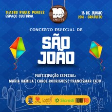 O concerto junino traz no repertório canções populares dos mestres da música que caracteriza essas festividades que tanto nos representam. Luiz Gonzaga, Dominguinhos, Antonio Barros e Cecéu e Jackson do Pandeiro são alguns dos compositores cuja obra irá embalar esta festa que mistura cordas com zabumba, sanfona e triângulo. Os ritmos tradicionais que embalam nosso São João estarão agitando o coração de quem se fizer presente neste concerto criteriosamente construído a partir do respeito profundo às nossas tradições nordestinas.