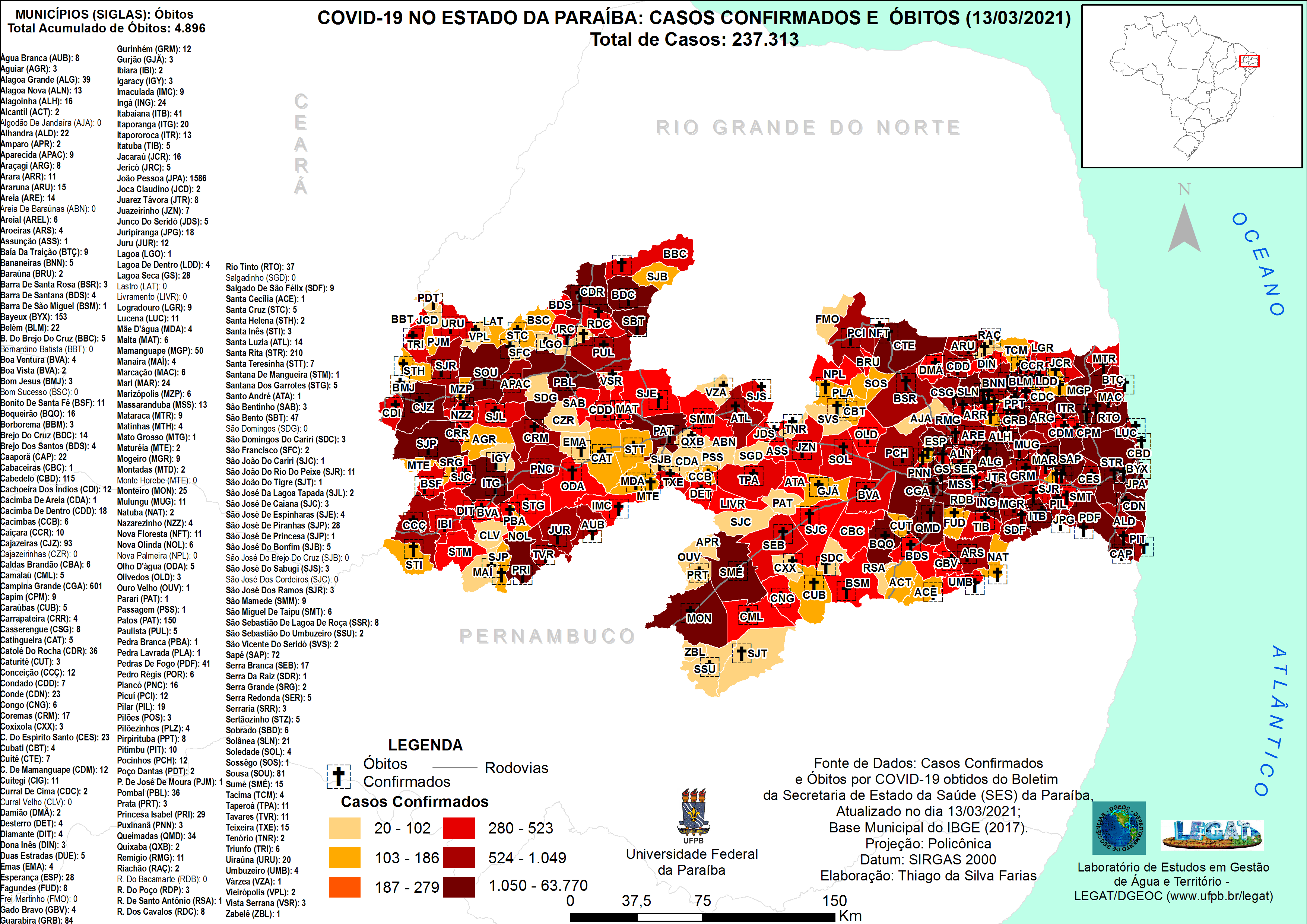 Casos confirmados e óbitos por COVID-19 no estado da Paraíba (13/03/2021).