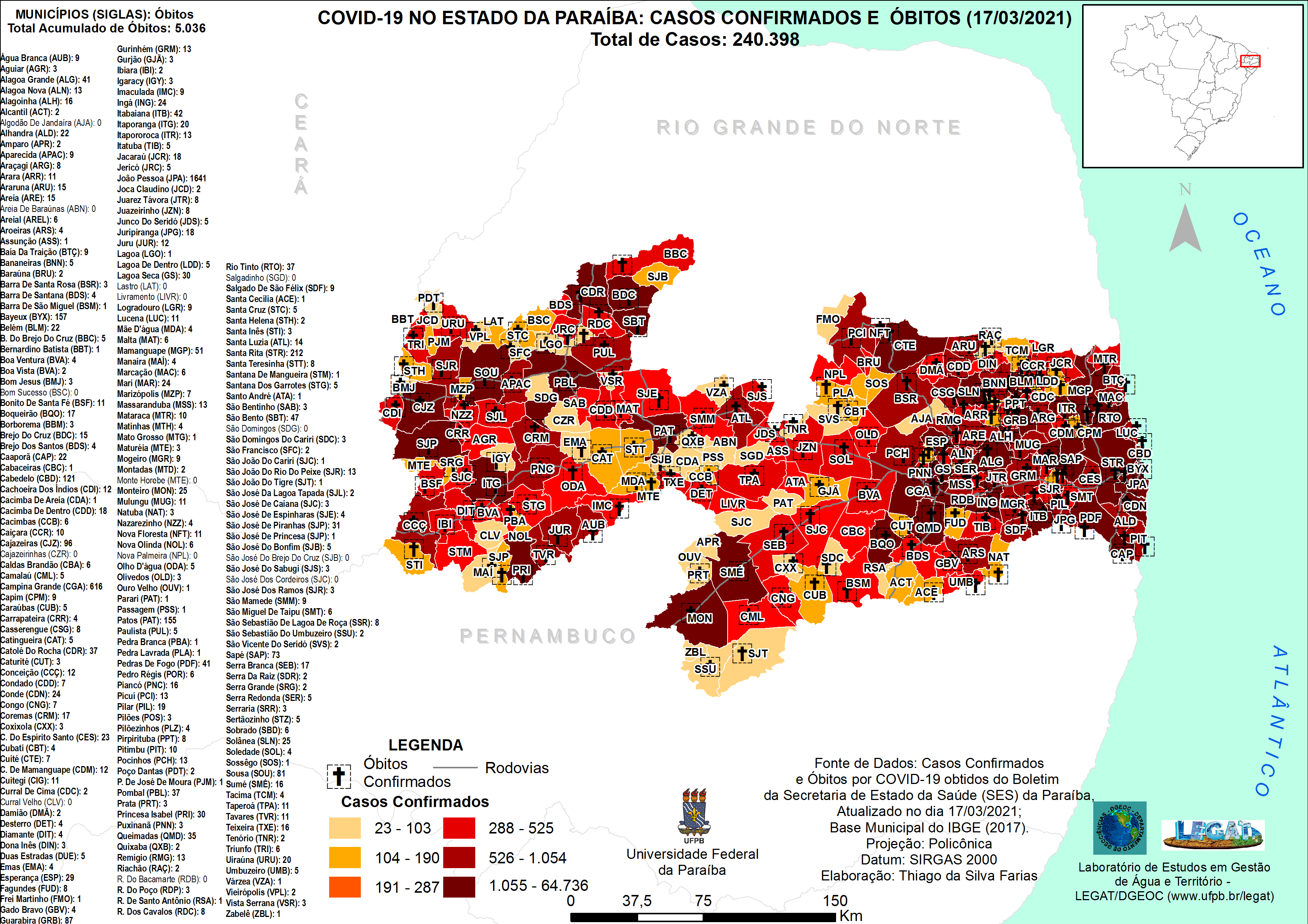 Casos confirmados e óbitos por COVID-19 no estado da Paraíba (17/03/2021).