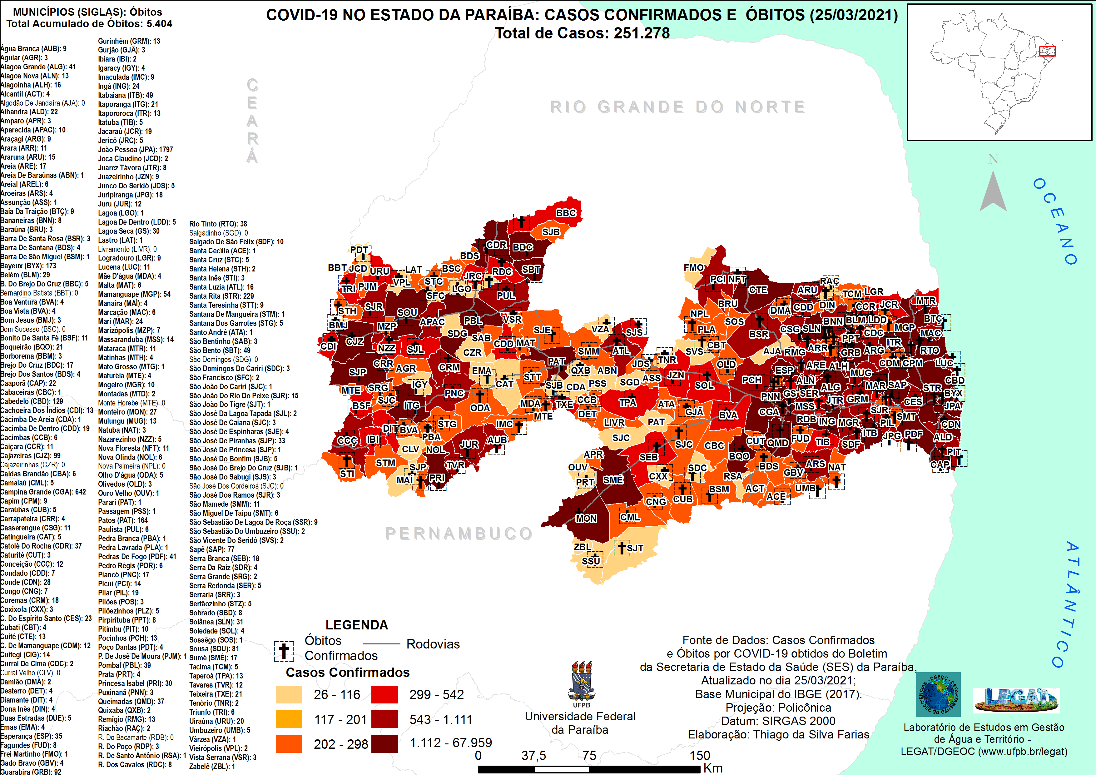 Casos confirmados e óbitos por COVID-19 no estado da Paraíba (25/03/2021).