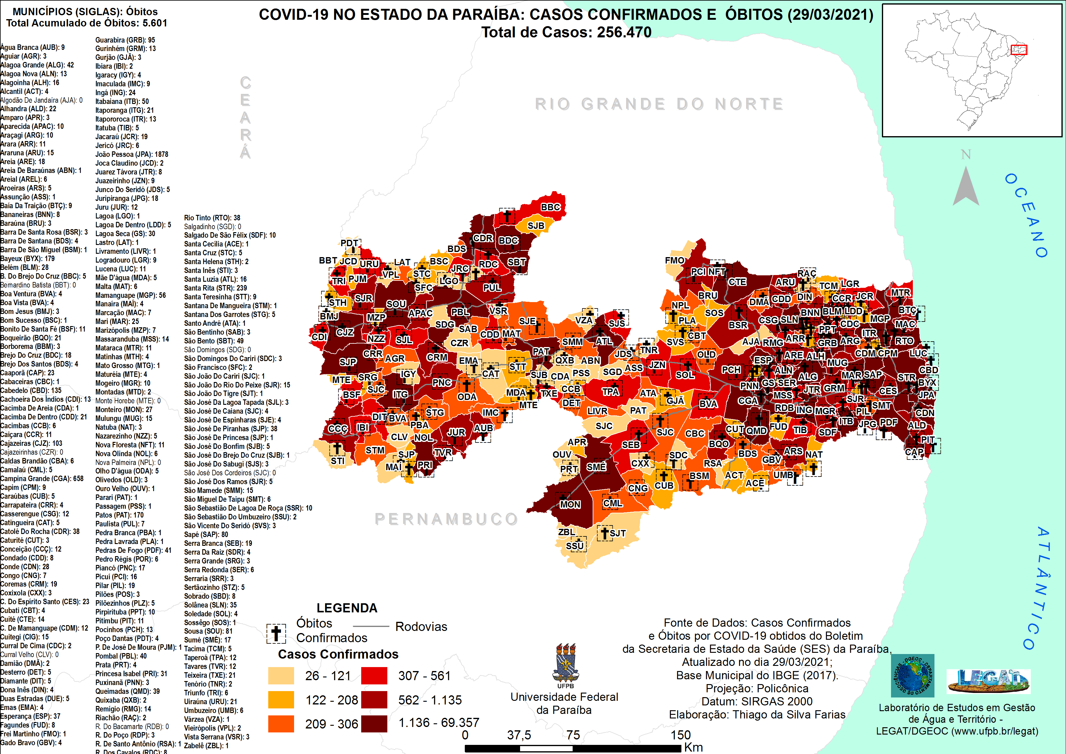 Casos confirmados e óbitos por COVID-19 no estado da Paraíba (29/03/2021).