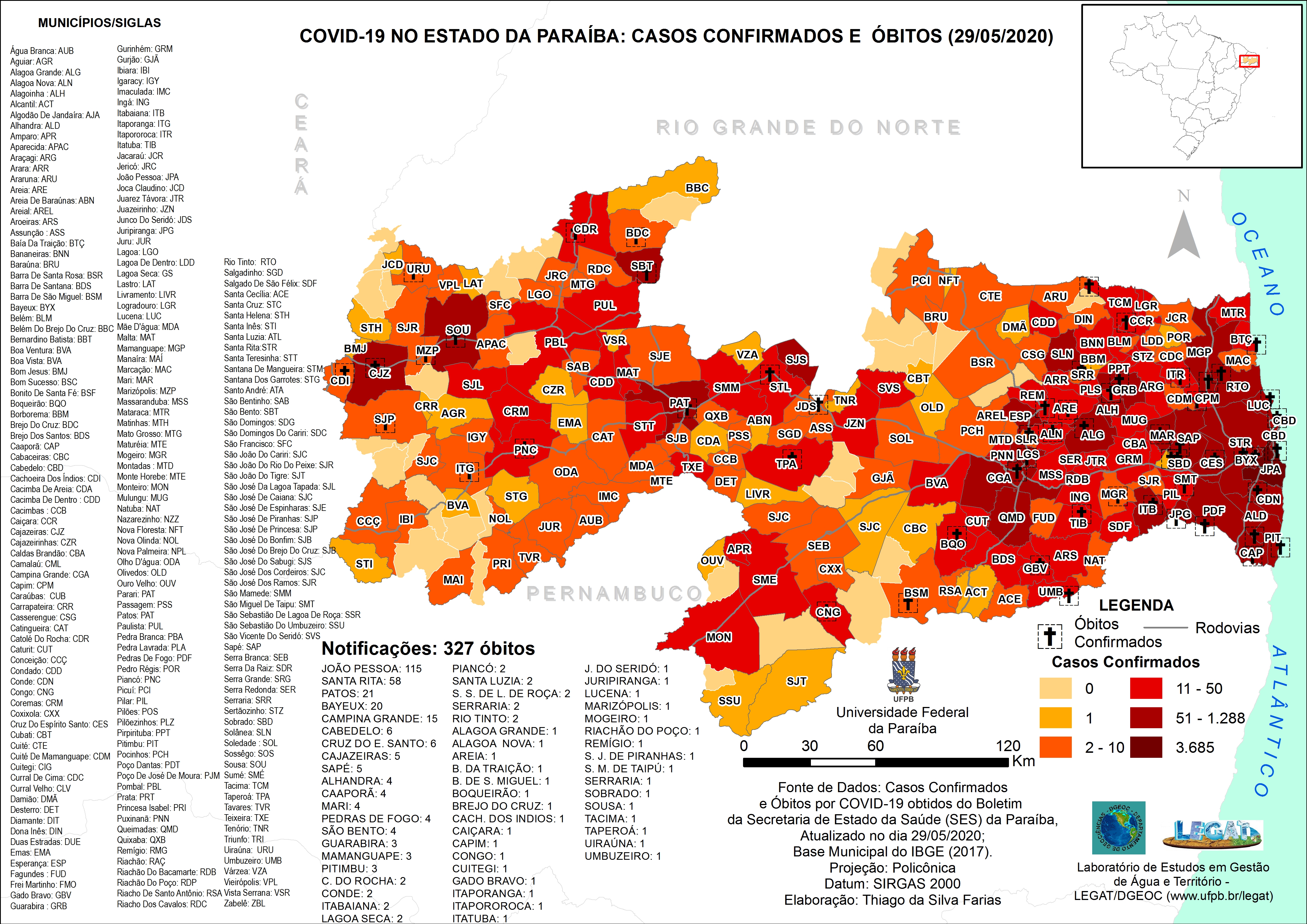 Casos confirmados e óbitos por COVID-19 no estado da Paraíba (29/05/2020).