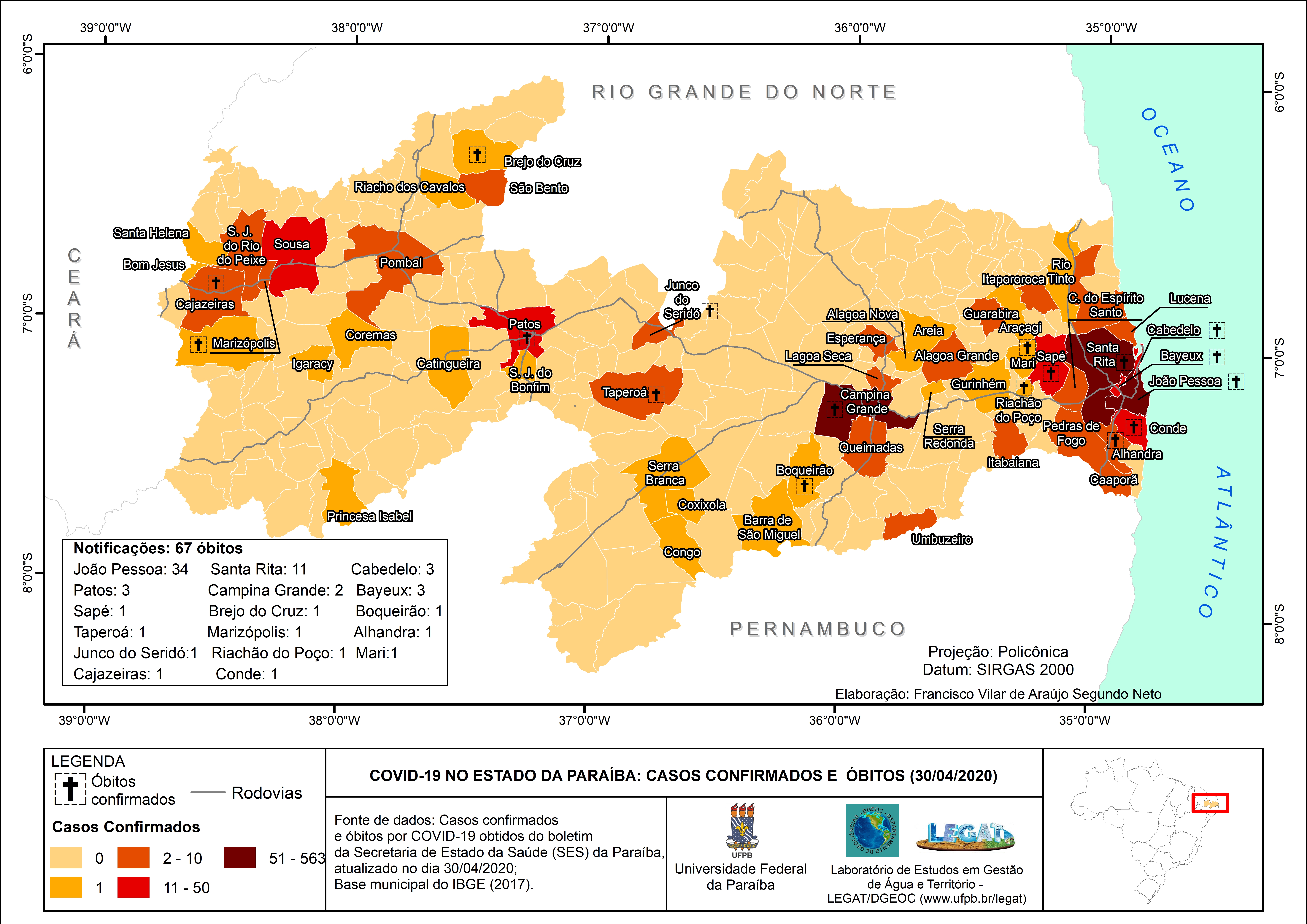 Casos confirmados e óbitos por COVID-19 no estado da Paraíba (30/04/2020).