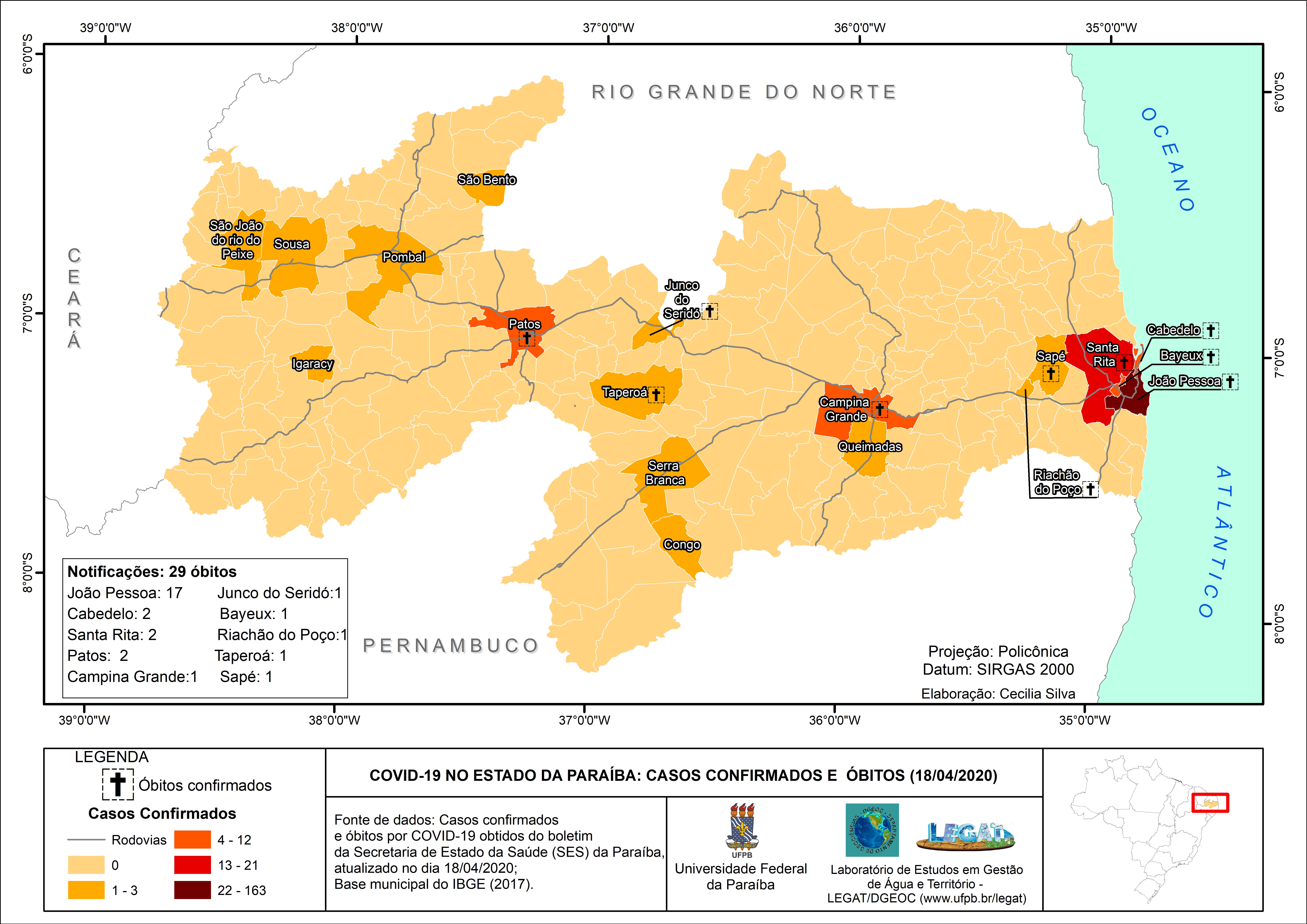 Casos confirmados e óbitos por COVID-19 no estado da Paraíba (18/04/2020).