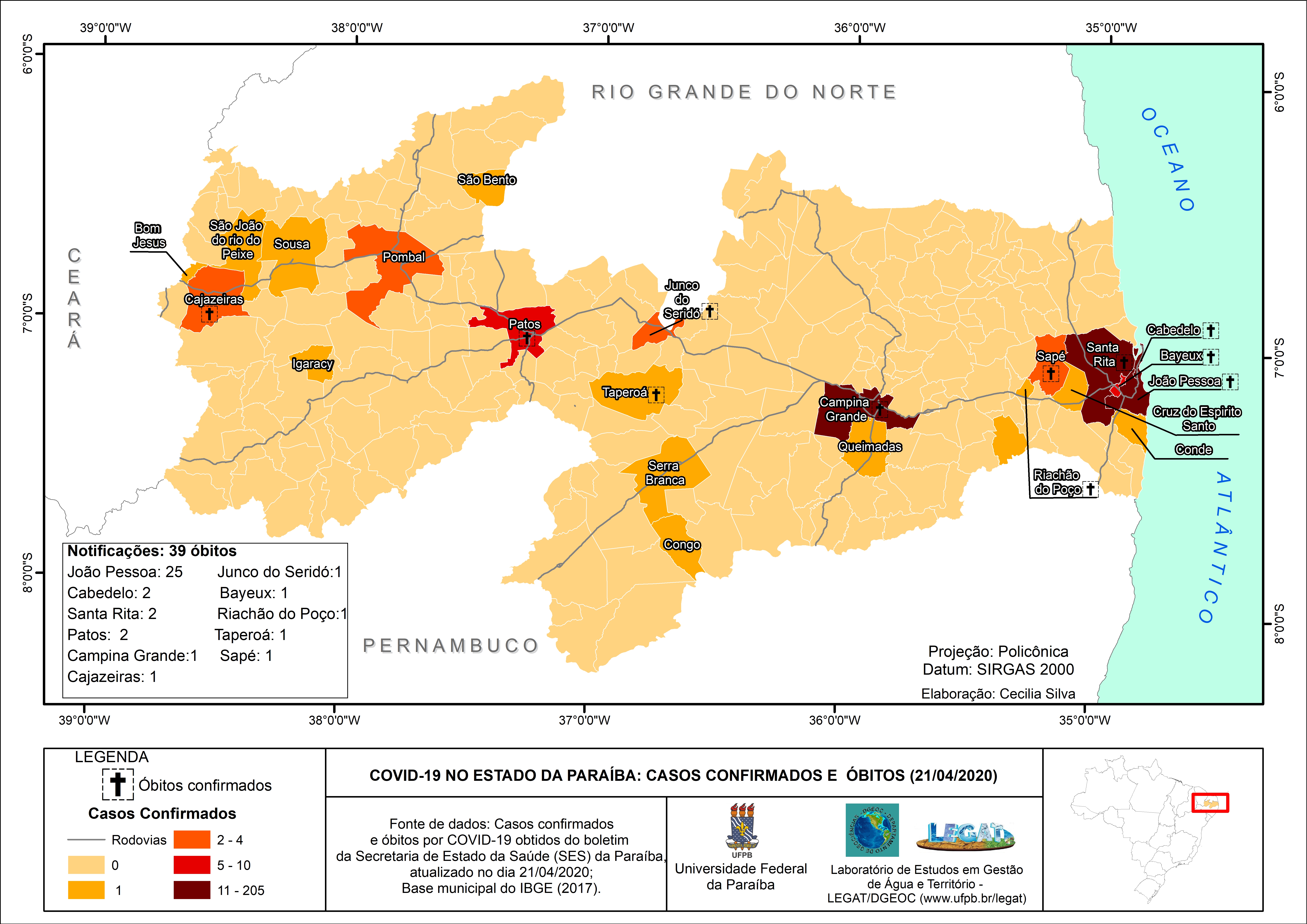 Casos confirmados e óbitos por COVID-19 no estado da Paraíba (21/04/2020).