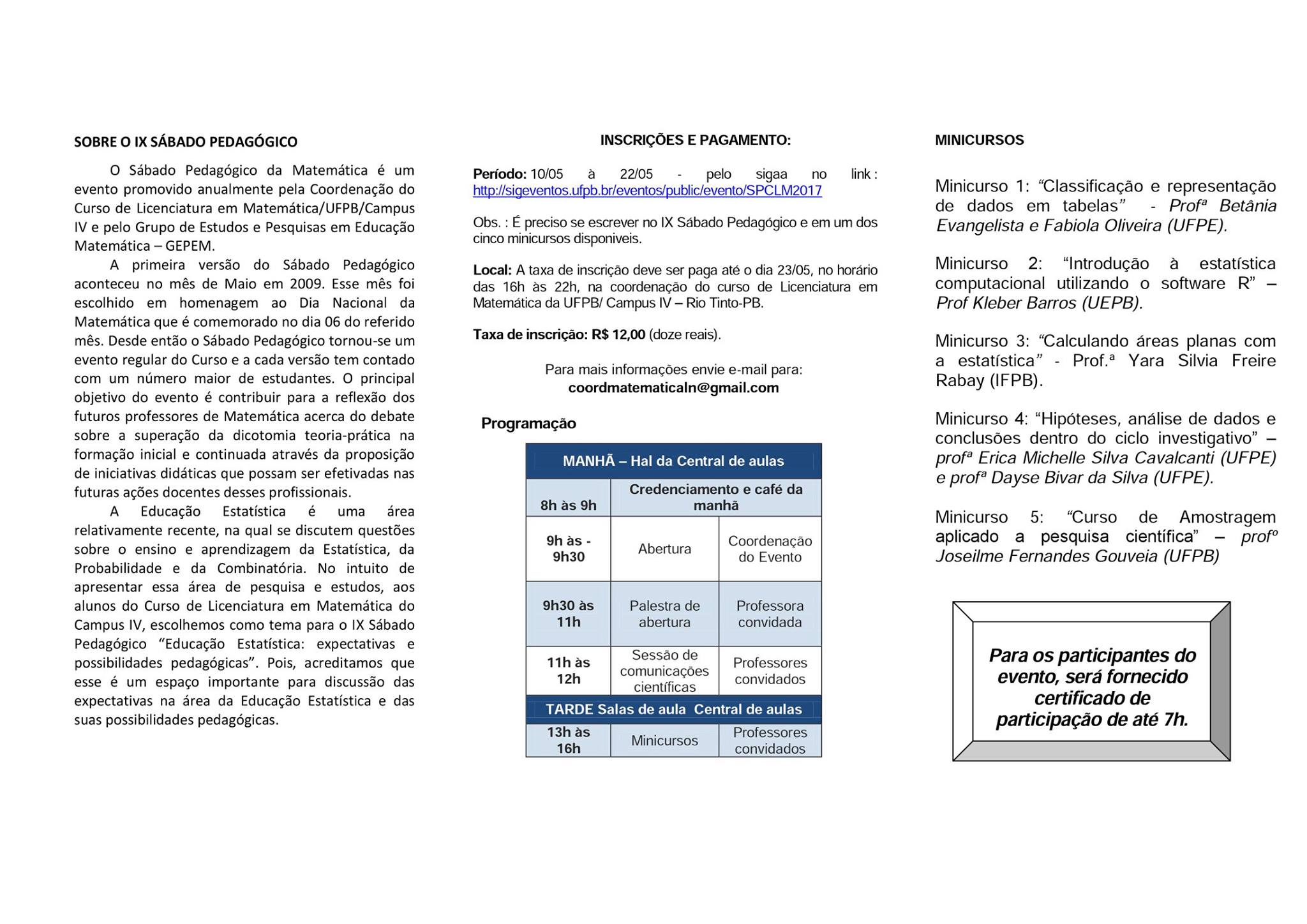 Convidamos toda a comunidade acadêmica a participar do IX Sábado Pedagógico da Matemática! O evento será realizado no dia 27/05/2017. Participem!