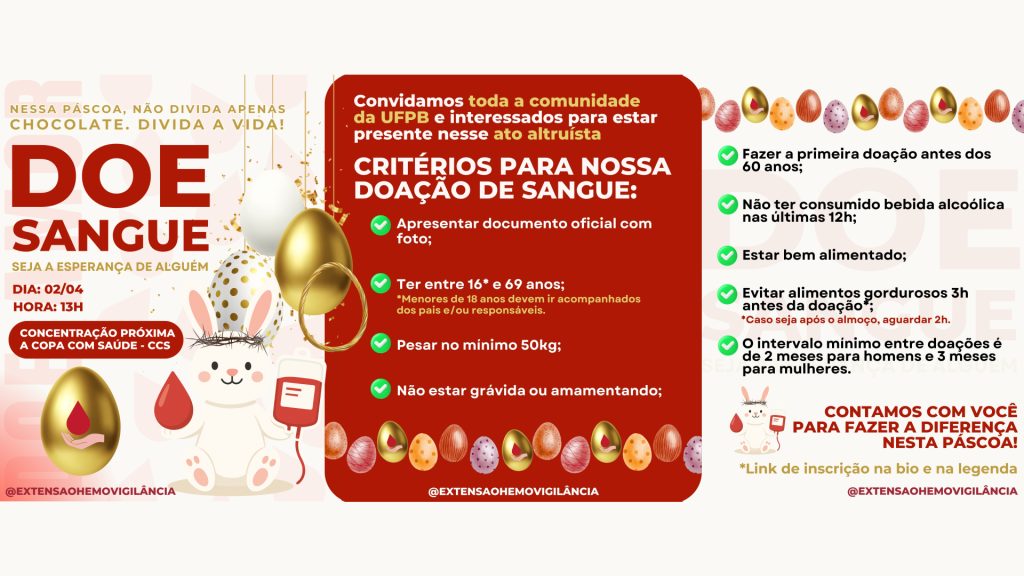 A Universidade Federal da Paraíba (UFPB) realiza, no dia 2 de abril, a Campanha de Doação de Sangue – Páscoa Solidária, com concentração às 13h, nas proximidades da Copa com Saúde, no Centro de Ciências da Saúde (CCS), no campus de João Pessoa. A iniciativa é promovida pelo Estágio III do curso de Farmácia, em conjunto com o Departamento de Ciências Farmacêuticas e a Extensão Hemovigilância, em parceria com o Hemocentro da Paraíba.