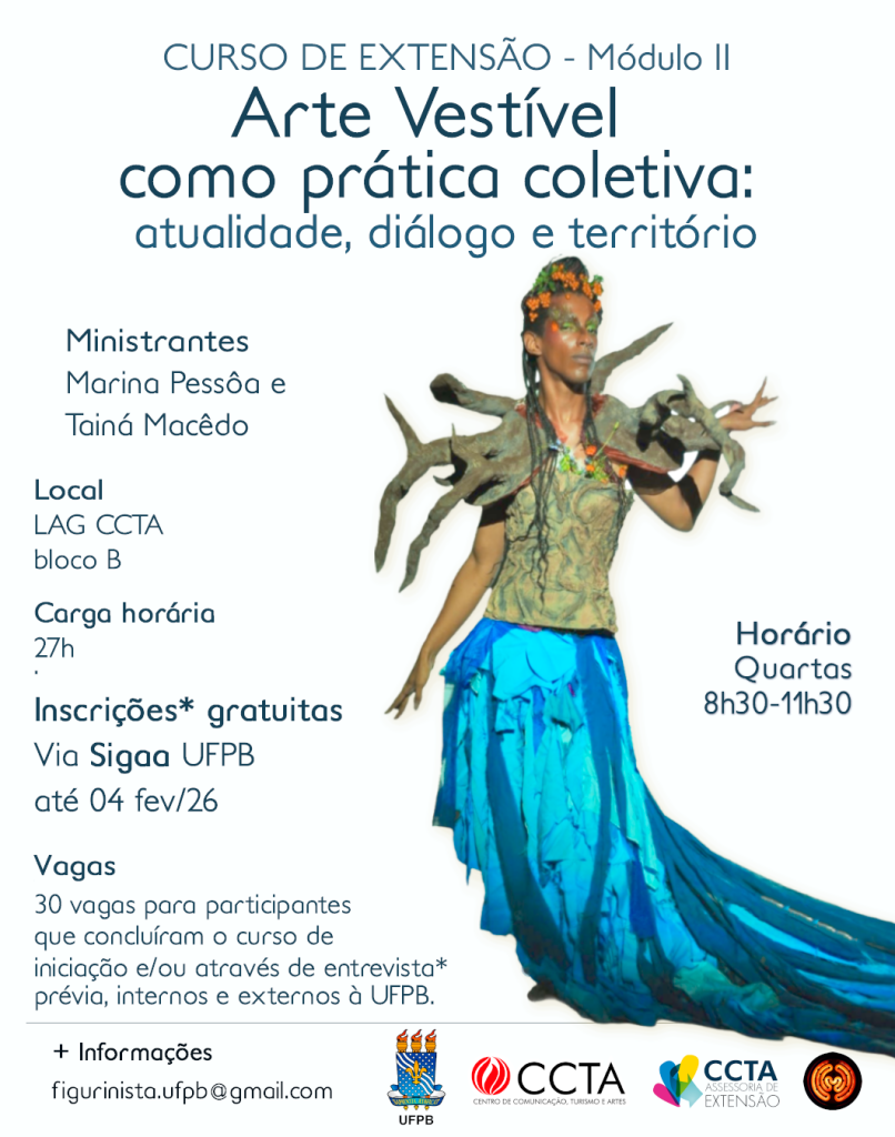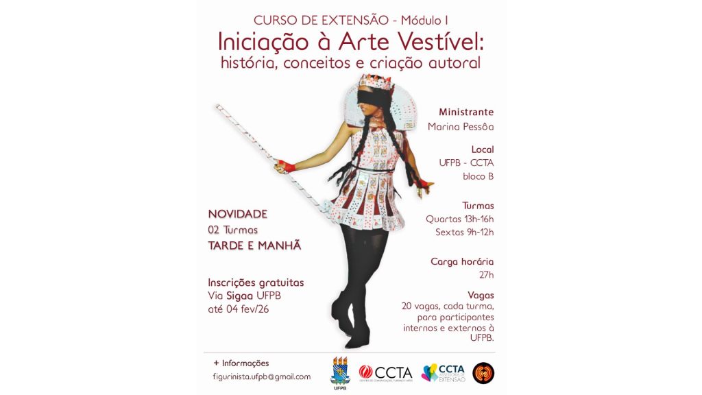 A iniciativa é promovida no âmbito do Centro de Comunicação, Turismo e Artes (CCTA) e tem como objetivo proporcionar uma formação teórica e prática, incentivando a criação autoral e coletiva a partir do corpo, da vestimenta e do território como elementos de expressão artística. As inscrições são gratuitas e devem ser realizadas pelo Sistema Integrado de Gestão de Atividades Acadêmicas (SIGAA).