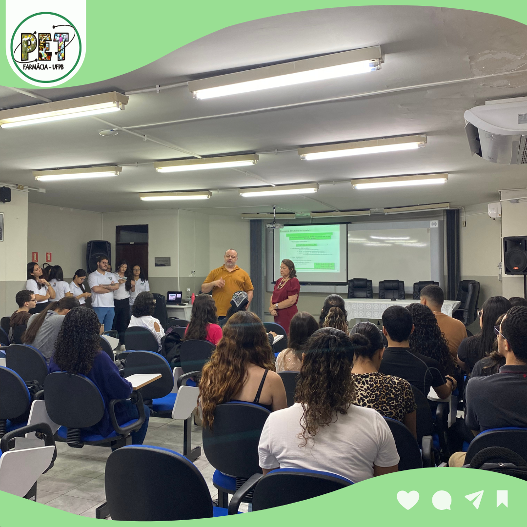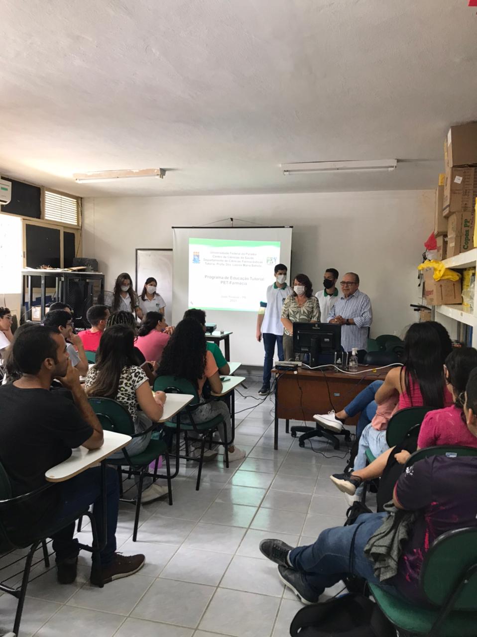 Acolhimento aos calouros apresentado de forma presencial no auditório do PET-Farmácia.