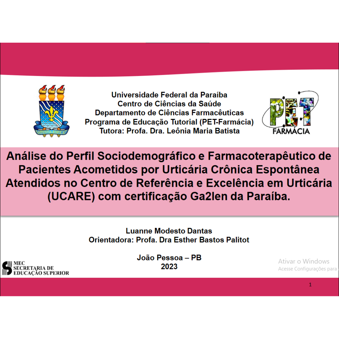 Título: Análise do perfil sociodemográfico e farmacoterapêutico de pacientes acometidos por urticária crônica espontânea atendidos no centro de referência e excelência em urticária-Ucare Ga2len da paraíba