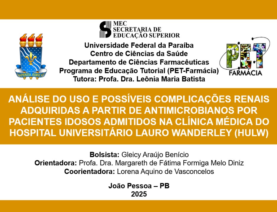 Tema: Análise do uso e possíveis complicações renais adquiridas a partir de antimicrobianos por pacientes idosos admitidos na clínica médica do Hospital Universitário Lauro Wanderley (HULW).