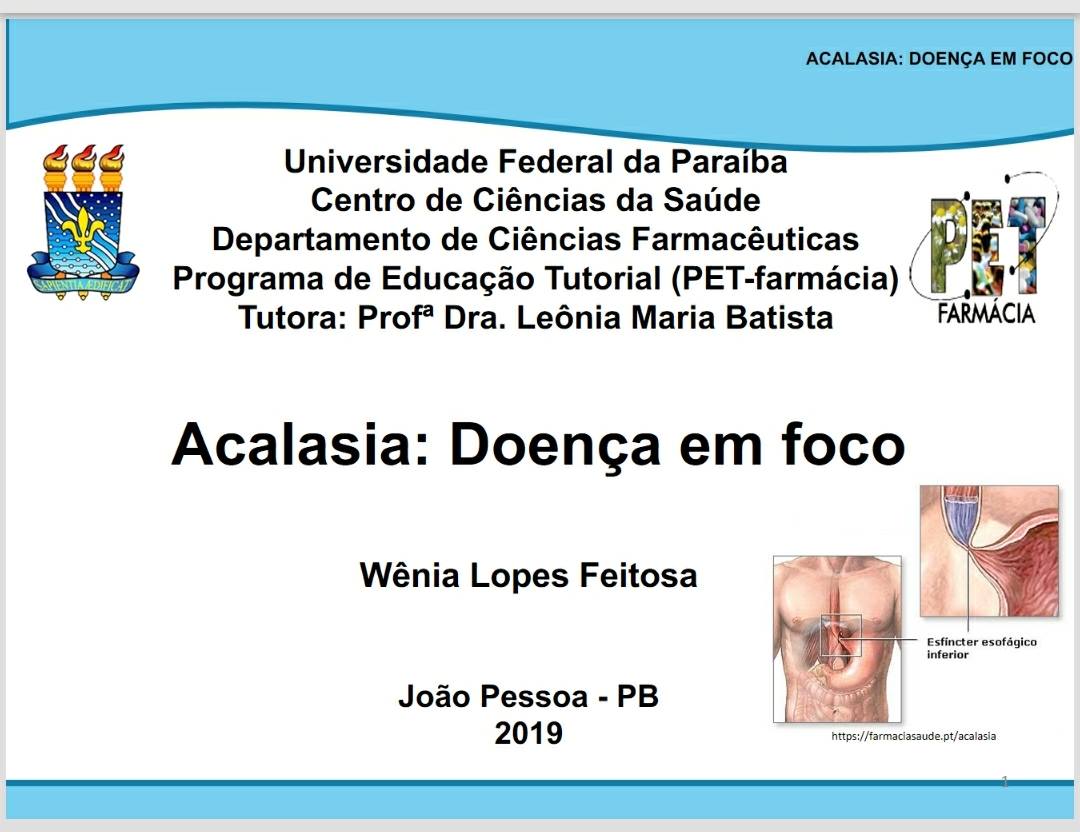 O PET-Farmácia, sob a tutoria da Professora Dra. Leonia Batista, convida a todos nesta terça-feira (23/07) às 12:00 para assistir o seminário que será apresentado por Wênia Lopes Feitosa sobre o tema "Acalasia: Doença em foco". A apresentação acontecerá no auditório do PET-Farmácia. Aguardamos você!