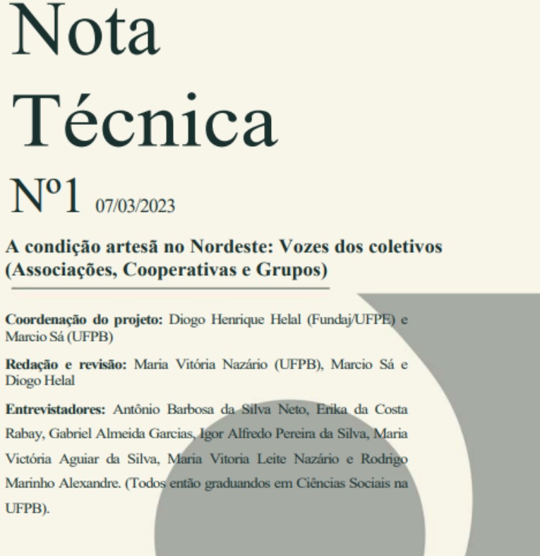 A Nota Técnica: "A condição artesã no Nordeste: Vozes dos coletivos (Associações, Cooperativas e Grupos)" tem origem no “Projeto Estruturação do Sistema de Gestão do Artesanato Brasileiro: Diagnóstico e Planejamento Estratégico”, que teve “como propósito a elaboração do primeiro diagnóstico do artesanato brasileiro que permita identificar os problemas que afetam o segmento, bem como estruturar propostas para o aperfeiçoamento das políticas públicas e da legislação federal em vigor destinadas ao desenvolvimento do setor artesanal” e coordenação nacional da equipe de estudos e pesquisa de Carlos Henrique Rezende Falci (UFMG) e Laura de Souza Cota C. Silva Pinto (UFMG). A coordenação da equipe Nordeste ficou ao cargo dos professores Diogo Helal (Fundaj/UFPE) e Marcio Sá (UFPB).