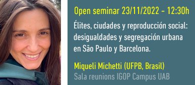 Nesta quarta-feira, dia 23/11/2022, a professora Miqueli Michetti (DCS e PPGS UFPB) apresentará sua pesquisa pós-doutoral em um Seminário Aberto no ciclo de Winter Seminaries do Institut de Govern i Polítiques Públiques (IGOP) da Universitat Autònoma Barcelona (UAB). O título do Open Seminar é "Élites, ciudades y reproducción social: desigualdades, educación y segregación urbana en São Paulo y Barcelona".