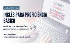 “INGLÊS PARA PROFICIÊNCIA - BÁSICO” que tem como objetivo capacitar os servidores para as seleções de mestrados e/ou doutorados, por meio do desenvolvimento de habilidades no que tange à compreensão de textos da língua inglesa; capacitar o participante a ler e interpretar textos em Inglês, além de desenvolver estratégias e práticas de leitura em Inglês e investigar recursos linguístico-textuais em língua inglesa.